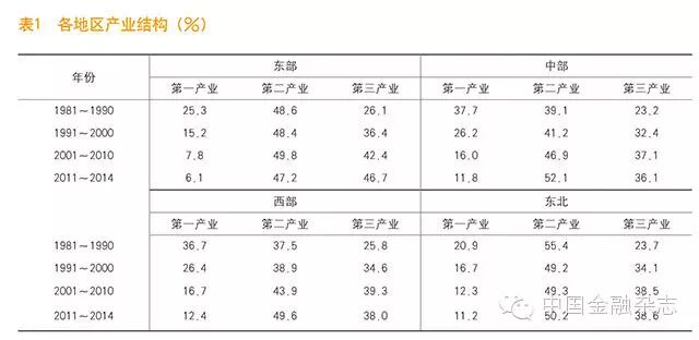 从产业结构看,东部地区第一、第二产比重下降,第三产业比重快速上升。第三产业比重由1981年的21.5%上升至2014年的48.8%,同期第一产业和第二产业比重分别下降20.3个和7个百分点至5.8%和45.5%。从2013年起,东部地区第三产业比重超过第二产业,成为东部经济增长的主要支撑。
