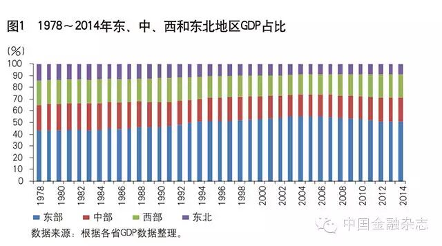 东部地区在全国GDP中的占比先升后降,从1978年的43.6%上升至最高点2006年的55.5%,再回落至2014年的51.2%;中部和西部地区占比先降后升,中部地区从1978年的21.6%逐渐降至最低点2003年的18.5%,再回升至2014年的20.3%;西部地区从1978年的20.9%逐渐降至最低点2005年的17.1%,再回升至2014年的20.2%;东北地区占比总体下行,从1978年的14%下降至2014年的8.4%。