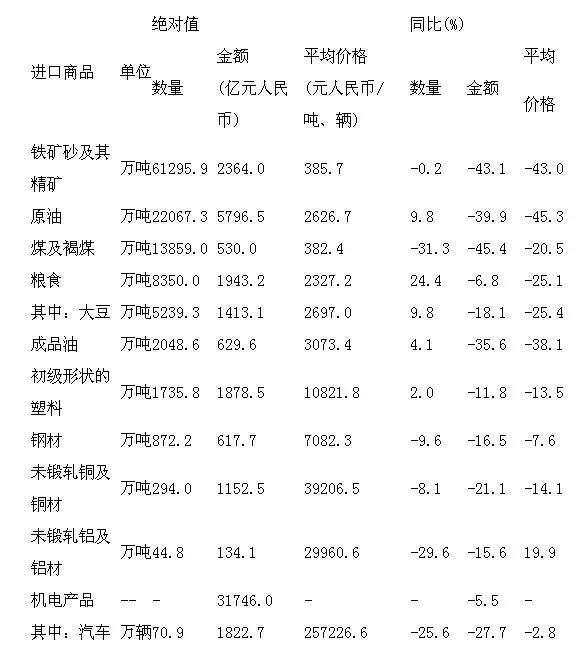 此外,进口粮食8350万吨,增加24.4%;其中大豆5239.3万吨,增加9.8%,进口均价为每吨2697元,下跌25.4%。机电产品进口3.17万亿元,下降5.5%;其中汽车70.9万辆,减少25.6%(表3)。