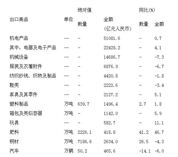 前8个月,我国机电产品出口5.11万亿元,增长0.7%,占出口总值的57%。其中,电器及电子产品出口2.24万亿元,增长4.1%;机械设备1.47万亿元,下降7.3%。同期,服装出口6876.9亿元,下降6.7%;纺织品4420.8亿元,下降1.8%;鞋类2222.6亿元,下降3.4%;家具2127.2亿元,增长5.1%;塑料制品1496.4亿元,增长1.8%;箱包1142亿元,增长5.9%;玩具582.7亿元,增长11.1%;上述7大类劳动密集型产品合计出口1.89万亿元,下降2.1%,占出口总值的21.1%。此外,肥料出口2226.1万吨,增加41.2%;钢材7186.6万吨,增加26.5%;汽车50.2万辆,减少14.1%(表2)。