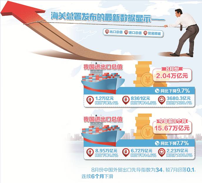 今年前8个月,我国进出口总值15.67万亿元,比去年同期下降7.7%。其中,出口8.95万亿元,下降1.6%;进口6.72万亿元,下降14.6%;贸易顺差2.23万亿元,扩大80.8%。