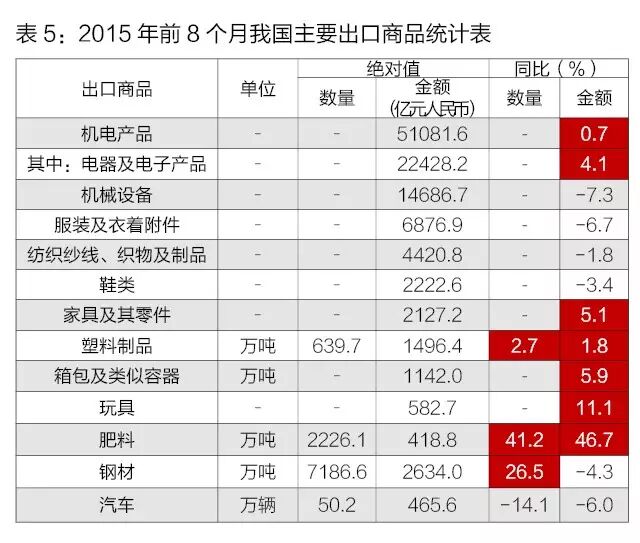 前8个月,我国机电产品出口5.11万亿元,增长0.7%,占出口总值的57%。其中,电器及电子产品出口2.24万亿元,增长4.1%;机械设备1.47万亿元,下降7.3%。同期,服装出口6876.9亿元,下降6.7%;纺织品4420.8亿元,下降1.8%;鞋类2222.6亿元,下降3.4%;家具2127.2亿元,增长5.1%;塑料制品1496.4亿元,增长1.8%;箱包1142亿元,增长5.9%;玩具582.7亿元,增长11.1%;上述7大类劳动密集型产品合计出口1.89万亿元,下降2.1%,占出口总值的21.1%。此外,肥料出口2226.1万吨,增加41.2%;钢材7186.6万吨,增加26.5%;汽车50.2万辆,减少14.1%。