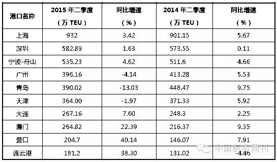 表3 2015年第二季度集装箱吞吐量全球前十大港口排名
