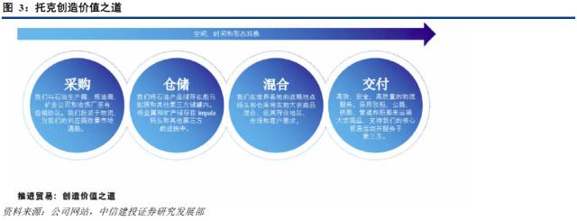 像其他大宗商品贸易公司一样,托克通过对商品进行时间、空间和形态的转换创造价值,将商品从生产方和供给过剩方安全、高效地转移给世界各地的需求者。托克利用其规模经济的优势大量采购,有着强大的谈判能力来获得成本较低的商品。托克使用期货、交换等标准衍生工具来对冲平价风险,减小风险敞口,并通过全球采购来规避地区性风险。然后,通过其分布在世界各地的中游资产对商品进行仓储、混合、运输,并时刻关注市场寻找实物套利的机会。对于中游资产的布局和采购使托克对第三方物流、仓储的依赖性大大降低,使其节省了大量的交易成本,提高了中游环节的运作效率,也为其对实物商品的灵活操作创造了可能。最后,托克将商品安全地交付买方,完成价值创造的链条。而在这整个过程中,托克较为完善的资金结构提供为贸易源源不断的资金支持,其风控体系为贸易规避风险、保驾护航,其研究部门紧密监控每一步的操作,提供智力支持。