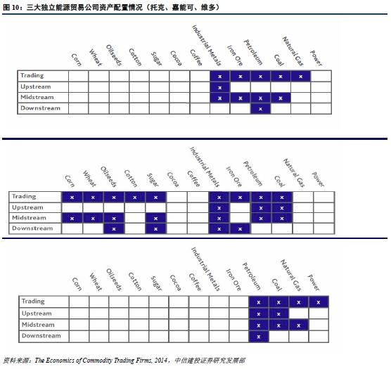从托克围绕石油、煤炭、工业金属和铁矿石等产品的资产布局来看,托克与其他能源贸易巨头有着较为明显的区别。托克对所有贸易产品都设置了比较完善的中游资产,对于第三方物流、仓储、混合的依赖程度较小。同时,托克对工业金属的生产进行了部署,并通过彪马能源进行石油的下游分销。但是,托克没有像嘉能可和维多一样在某一商品上形成完整的产业链。尤其是像维多这种同样属于轻资产的贸易公司在石油贸易上整合了整条产业链,并成为了世界最大的石油及石油产品贸易商,这为托克提供了可借鉴的经验。由此看托克在资产整合方面还有较大的发展空间。