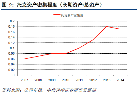 相比较于嘉能可、嘉吉这样一些主要的贸易公司,托克一直都有着较低水平的固定资产配置,属于轻资产的贸易公司。托克在前期发展过程中主要着力于发展贸易业务,打开市场,以形成规模经济的优势;而在最近10余年,托克逐渐加快了在固定资产的投资步伐,以整合产业链。尤其是2010年之后,托克的资产密集程度获得了显著提升,2014年资产密集程度已经达到了2007年的3倍。目前,托克已经根据自身业务情况形成了比较成熟的固定资产布局,在其主要贸易产品领域内,达到了较高的资产利用效率。