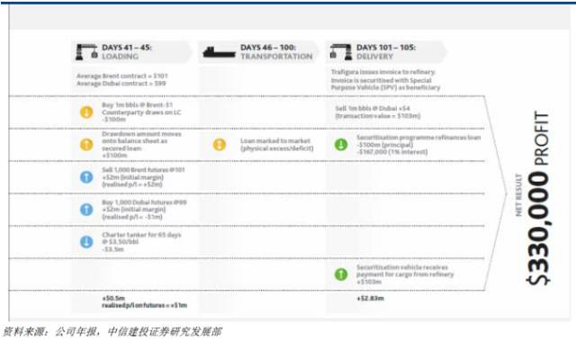 第41-45天为装货阶段。以原油期货价格上涨为例,期限内平均布伦特原油价格为101美元,迪拜价格为99美元。此时在现货市场,托克以100美元/桶的价格买入100万桶原油,供给方从信用额度提取相应金额。在托克的资产负债中,相应数目计入抵押贷款项目下。在期货市场,以101美元卖出1000手布伦特原油期货(盈利200万美元),以99美元买入1000手多哈原油期货(损失100万美元),并拿回初始保证金400万美元。托克在期货市场实际盈利100万美元。此外,托克还需要支付运费,以每桶3.5美元计。在此阶段,托克的净现金流量为+50万美元,实现盈利100万美元。