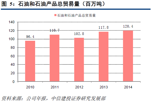 自从2010年托克参与煤炭的贸易以来,公司每年的煤炭交易额都取得很大提高,并在2014年成为了排名前三的煤炭贸易公司。2014年,煤炭贸易量增长更加迅猛,达到3290万吨,比2013年增长92.35%。随着贸易量的增加,公司的规模经济也会增加,使得其全球套利的能力也得到了提高。
