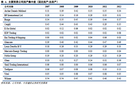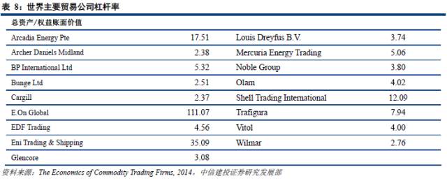 与金融部门相比,商品贸易公司的杠杆率通常不高。如果采用总资产与净资产的比值来衡量杠杆率,则在下图中展示的2012年17个贸易公司的杠杆率中位数为4。其中,对于相对重资产的企业,如嘉吉、嘉能可等,有着较低的杠杆水平,与非金融企业的杠杆水平相近。