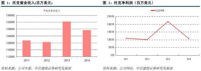 托克的营业收入和营业利润从成立以来都在小幅的震荡中稳定增长,其中,2013年的营业收入与净利润均达到了历史最高,分别为1330.26亿美元和21.81亿美元。2014年略有回落,但营业收入仍高于除2013年的其他年份。