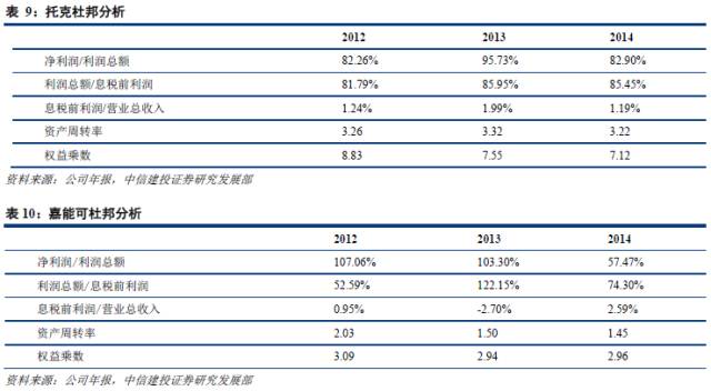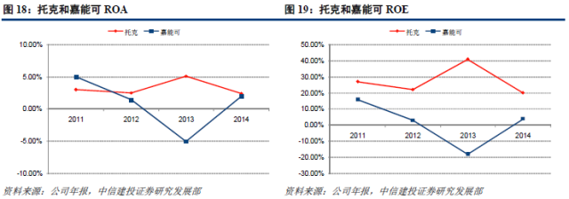 与嘉能可进行对比,托克有着更高而且更加稳定的资产收益率和净资产收益率,显示了托克更强的运用资产的能力。托克的净资产收益率近四年一直保持在19%以上,其中2013年高达41.13%。
