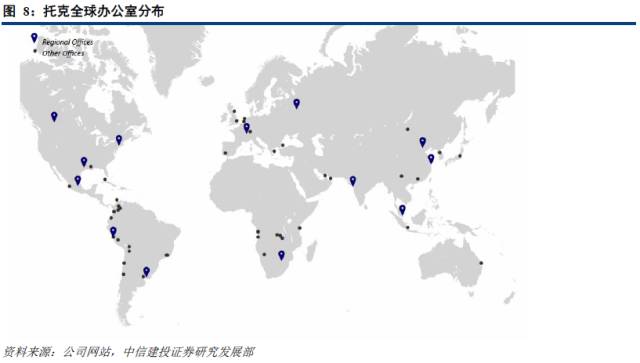 截止至2014年,托克在全球各地的36个国家有65个办事处,平均员工数量为5326人。托克通过总部和其他各地的地区性办事处建立起全球网络,支持托克的贸易活动。所有的地区性办事处都可以获得托克的知识储备和信息资源,也为托克的发展提供支持。此外,为解决外国雇员不了解当地情况的问题,托克在世界各地的办事处进行了很好的本土化改进,大部分的高层管理人员和员工由当地人担任。