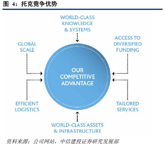在竞争激烈的全球贸易市场中,托克的优势在于其全球规模的运作、世界顶级的资产和基础设施配置、高效的物流、完善的客户服务、多样化的资金来源以及雄厚的知识和技术支持。