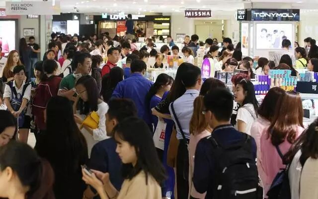 9月30日,在位于韩国首尔小公洞的乐天免税店,中国游客人头攒动。据推测,中国国庆节长假期间(10月1-7日)将有21万中国游客来韩旅游。