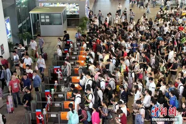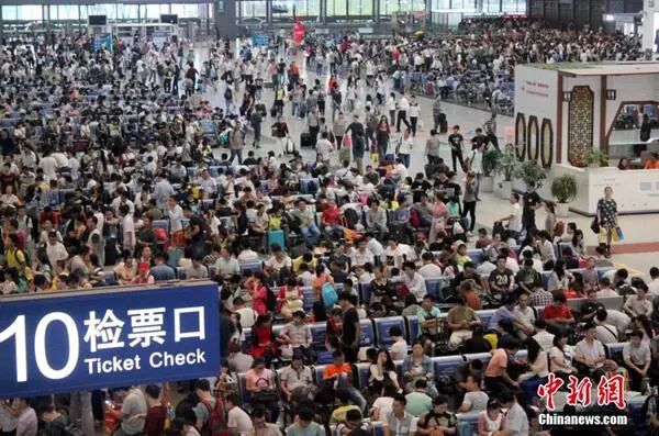 ↑10月6日,江苏苏州火车站候车大厅内人潮涌动。