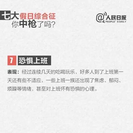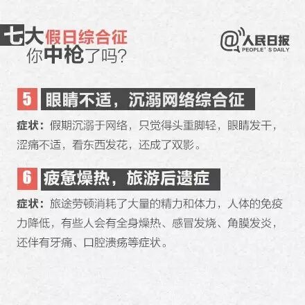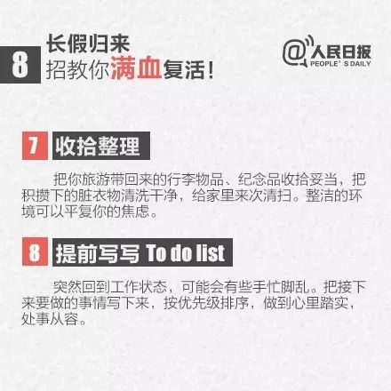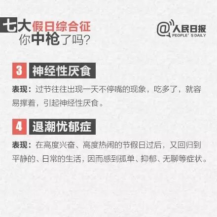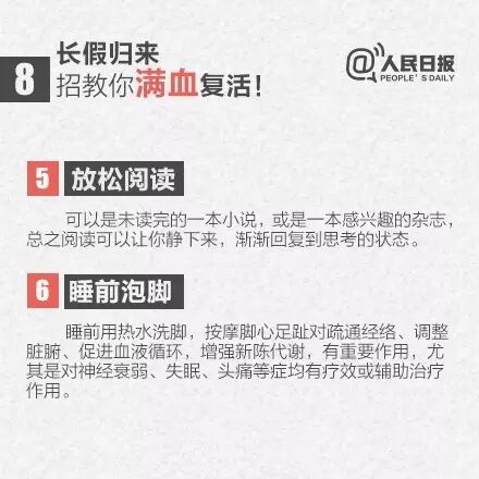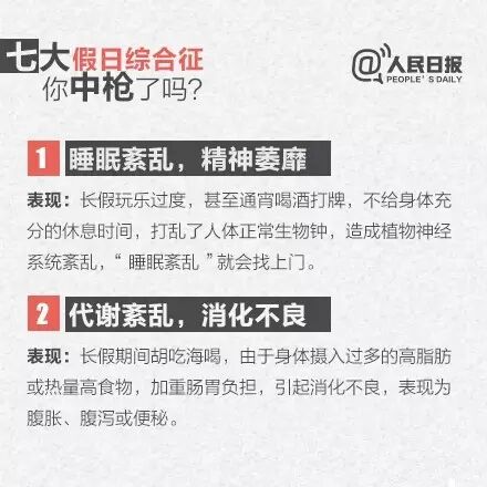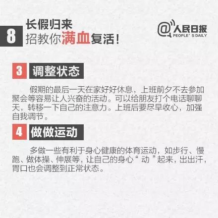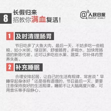 建议:在精神状态方面,可以利用长假最后一天好好睡一觉,把颠倒的生物钟调整过来。此外,节假日期间不规律的就餐可能造成胃肠功能紊乱。在长假结束之际,每日早中晚就餐时间应对照日常作息进行调整。选择食物尽量清淡,主食以谷类为主,可适量增加玉米、燕麦等;多吃富含维生素的蔬菜瓜果;多喝开水加快胃 肠道新陈代谢,减少肉类食物和酒类的摄入。