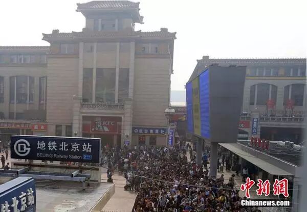 ↑旅客在北京站地铁口等待进站乘坐地铁。