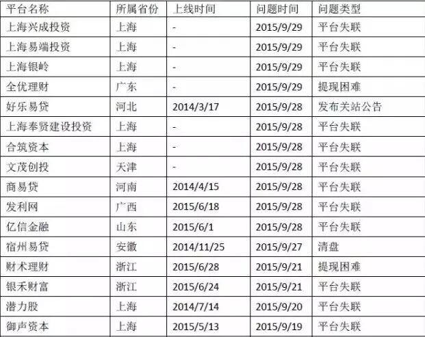 2015年9月新增问题平台54家,环比8月的46家上升17.39%,与去年同期23家相比上升134.78%。54家问题平台分布在全国15个地区。其中山东省本月新增问题平台16家,占本月新增问题平台总数的29.63%,排首位。上海、广东位列其后,分别为11 、6家,其余省份9月新增问题平台均不超过3家,8月、9月两月,新增问题平台数较上半年各月有了一定的下降。