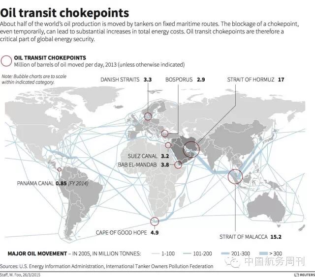 由于集中度较高,一旦其中任何一条海上运输通道被破坏或者关闭,都会引发国际油价不可预测的波动。比如,沙特近期空袭了也门境内的叛军,战火一度引发国际油价暴涨,就是因为也门南部海岸的曼德海峡(Bab el-Mandab)是一条主要的国际原油贸易通道,平均每天有380万桶原油途经此地。