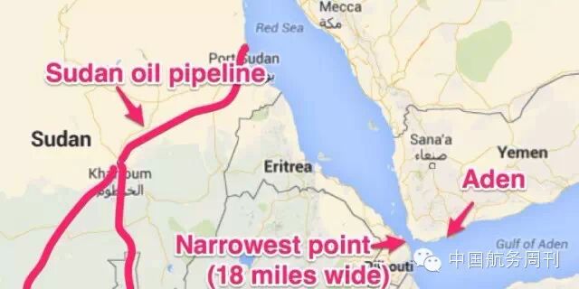 连接着红海和亚丁湾(Gulf of Aden)、并最终通往印度洋的曼德海峡最窄处仅18英里。如果它关闭或者处于不稳定状态,那么国际邮轮将被迫改变航线转往非洲南部的好望角。