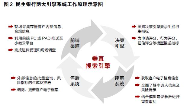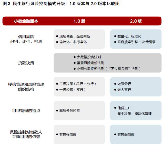 民生银行发挥传统银行研究实力强、数据收集和数据分析能力强的优势,将信息技术转化为控制小微金融信贷风险的抓手,这将使风险控制手段从经验控制、人工监测转变为数据分析和自动化监测,而风险控制流程的重点也从前台转向了中后台。
