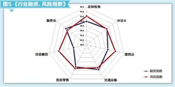 农林牧渔业小微企业融资指数为49.9,较上月下降1.0个点,建筑业小微企业融资指数为49.1,较上月下降0.9个点,交通运输业小微企业融资指数为51.6,较上月下降1.1个点,住宿餐饮业小微企业融资指数为45.6,较上月下降1.1个点,服务业小微企业融资指数为51.0,较上月下降0.5个点。