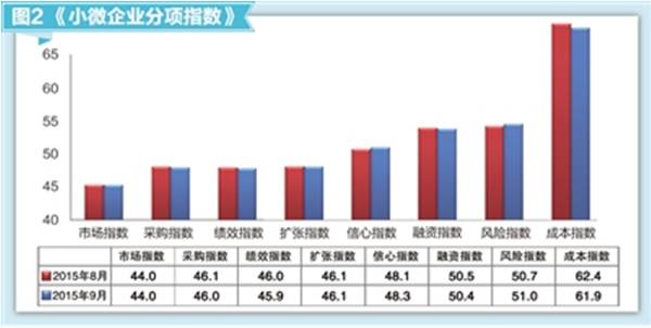2015年9月份“经济日报—中国邮政储蓄银行小微企业运行指数”(见图1)发布。从各分项指标指数(见图2)来看,呈现“两升两平四降”态势。其中市