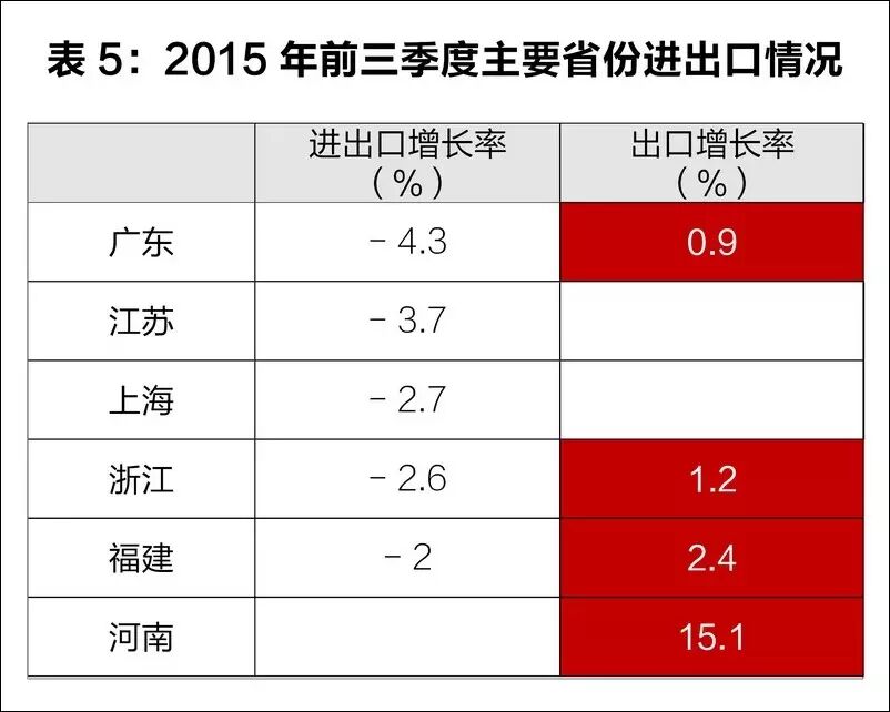 四、广东等外贸大省市表现好于总体,优势明显。前三季度,广东、江苏、上海、浙江和福建等省市进出口虽然分别下降4.3%、3.7%、2.7%、2.6%和2%,但优于7.9%的总体进出口降幅。同期,广东、浙江、福建出口分别增长0.9%、1.2%和2.4%,河南出口增长15.1%。