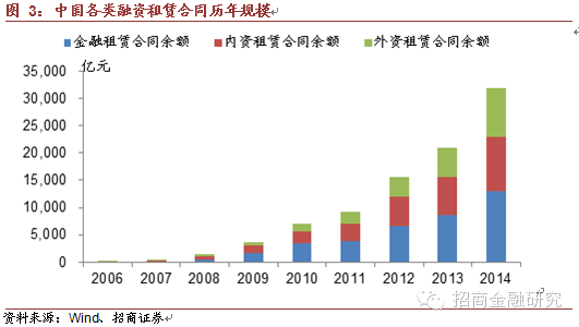 除了应收账款以及商业汇票以外,融资租赁与供应链金融同样紧密相连。近几年我国融资租赁业得到了飞速的发展,租赁合同额不断增加。2014年融资租赁合同余额已经超过了3万亿。其中,三种租赁种类中又以金融租赁合同规模最大,2014年合同规模占比达到41%。融资租赁的快速发展对于需要大规模专业设备的企业来说十分有利,对于供应链金融的发展同样意义重大。