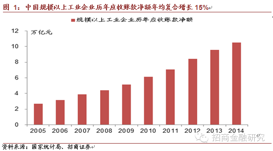 按照融资所需的资产不同,供应链金融模式可以分为应收账款融资模式、融通仓融资模式以及保兑仓融资模式。这三种融资模式的依据资产分别为:应收账款等应收类资产、存货以及预付账款等预付账款资产。我国规模以上工业企业应收账款净额已由2005年的不到3万亿增加到了2014年的10.52万亿,十年里增长了3.55倍,年均复合增速15%。我国商业汇票签发量逐年稳步增加,在2014年已经突破20万亿,2015年上半年也已经达到了11万亿。