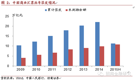 在企业交易中,企业之间还会以签发商业汇票的形式来保证交易正常进行。商业汇票的签发缓解了买方的资金压力,同时卖方拥有商业汇票,既拥有对于签发方的汇票金额索取权,也可向商业银行作质押,获得流动性。商业汇票质押以获取融资也是供应链金融的重要形式,我国商业汇票发展与我国供应链金融的发展也是紧密相关的。如图2所示,我国商业汇票签发量逐年稳步增加,在2014年已经突破20万亿,2015年上半年也已经达到了11万亿。