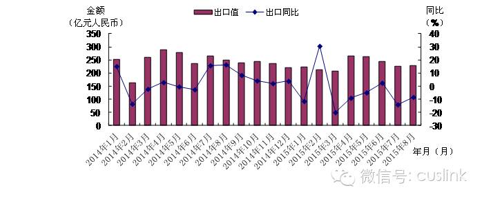 (一)8月份仍延续同比降势但降幅有所收窄。今年年初我国家电出口低迷,其中3月份规模探至年内低位后出现回暖,同比降幅逐月收窄,6月份实现止跌回升后增势未能保持,7月份下降14%,8月份延续降势,当月出口228.1亿元,同比下降8.3%,降幅较7月份收窄5.7个百分点,环比增长0.5%(下图)。
