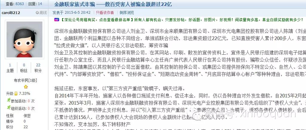 金融联家族式诈骗 数百受害人被骗超22亿 深圳市金融联融资担保有限公司法人刘金卫、深圳市金来顺集团有限公司、深圳市光电集团控股有限公司法人陈靖(刘金卫下属),以及多家关联公司竟然不惜以家族为核心进行诈骗,光电集团、金融联两个利益集团以各种不同组合,单独或联合行动,非法集资超过22亿元,已知直接受害人累计200多人,间接受害人超过千人,东窗事发后,提出申报的受害人数仍在不断增加。 “拉虎皮做大旗”,以人民银行名义非法吸款,筹资诈骗 刘金卫及其控制的金融联融资担保有限公司,在其网站、印刷、散发的宣传资料上,宣传是人民银行组建的深圳电子结算中心打造的品牌。刘金卫家族、陈靖欺骗公众,宣传陈靖以前在人民银行任职办公室主任,而且人民银行金融结算中心主任肖广昶代表人民银行在其公司持有股份,骗取公众信任,怀疑涉及国有资产流失。 拖延还款,东窗事发,以“第三方资产重组”做幌子,瞒天过海 自2014年下半年开始,施害人以各种借口拖延支付利息、偿还本金,同时,仍以各种理由对外发生借款。自2015年2月起,施害人逐渐被部分债权人起诉、冻结资产,引起了其他债权人的高度紧张。2015年3月,施害人深圳市金融联融资担保有限公司、深圳光电产业控股集团有限公司先后组织了“债权人大会”,当会说明了施害人对外融资金额已超过人民币22亿元,且施害人严重资不抵债的情况,声明停止支付利息,并以“引入第三方资产重组”(广泰源空壳公司)为幌子,诱惑各债权人债转股。会后,经债权人自发统计,在全体债权人未到会的情况下,现场被害人人数已累计达到156人,已参加债权人大会现场的债权人金额统计已超过12亿元人民币。 不知悔改,变本加厉,私下转移财产 然而自2015年3月债权人大会后,施害人非但没有主动寻求有效解决方案,反而在“引入第三方资产重组”的掩饰下,不断私下转移各种资产。 受害人深受其害,几乎“家破人亡” 许下高额回报 自称有央行背景 日前,有多名投资者向本报反映,深圳市金融联融资担保有限公司以高额回报和银行背景为诱饵,吸引了众多投资者投资,但如今这些投资者既无法收取利息,也无法拿回本金。投资者怀疑,该公司设下庞氏骗局,将他们的投资资金转移,涉嫌集资诈骗。据了解,目前该公司对外公布债务已达到22亿元,完全丧失还款能力。 连续多日,大批投资者赶到位于福田区财富大厦的金融联融资担保有限公司(以下简称深圳金融联公司)总部讨要说法,但如今总部仅剩下一些基层人员留守,财富大厦有部分楼层属于金融联公司自有物业,不过也已经被低价转移到了其他股东名下。 在金融联公司网站上也提到,该公司2003年成立以来,得到了政府、银行、行业协会等机构的大力支持,先后获得了工商银行、农业银行、建设银行、交通银行、招商银行等多家金融机构逾30亿元的授信额度支持。 月息高达5% 大批投资者遭殃 有投资者表示,实际上早在2013年就有投资者已经无法正常收取利息,也无法拿回自己的投资款,到2014年这类问题逐渐增多,但金融联公司仍表示,他们有多个投资项目,其中有不少都在盈利,但实际上是拆东墙补西墙、以新还旧,甚至在出现债务问题之后,金融联公司仍在不断拉人投资,月息也达到5%。 宝安警方立案 一名嫌疑人被拘 有投资人表示,当初之所以相信金融联公司,不只是他们宣称有银行背景,该公司也确实有一定实力。之前有投资者考察过金融联公司投资的一个房地产项目,当初这个项目一度烂尾,好多公司都无法盘活,最后金融联公司通过自己的关系,在该房地产项目上赚了1亿多元。 深圳市金融联融资担保有限公司管理团队简介 刘金卫 董事长 来源:信托圈(微信公众号:xintuoquan)