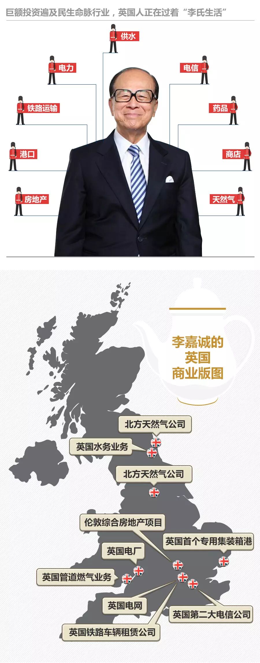 一张图告诉你李嘉诚,其实李氏的财富版图不只是中国,在英国也形成了强大的“财富城池”。其巨额投资遍及民生命脉的产业,如控制英国天然气近3成的市场,3成的电力供应、4成的电信市场。被形容为“买下了整个英国”,下图来自腾讯财经: