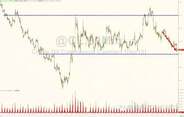 下图为周五美油走势。美油跌1.72%,收报44.60美元/桶,盘中创两个月新低,创三个月最大单周跌幅。过去两周,美油累计跌幅达到10%。同日,ICE布伦特12月油价收跌0.19%,收报47.99美元/桶。