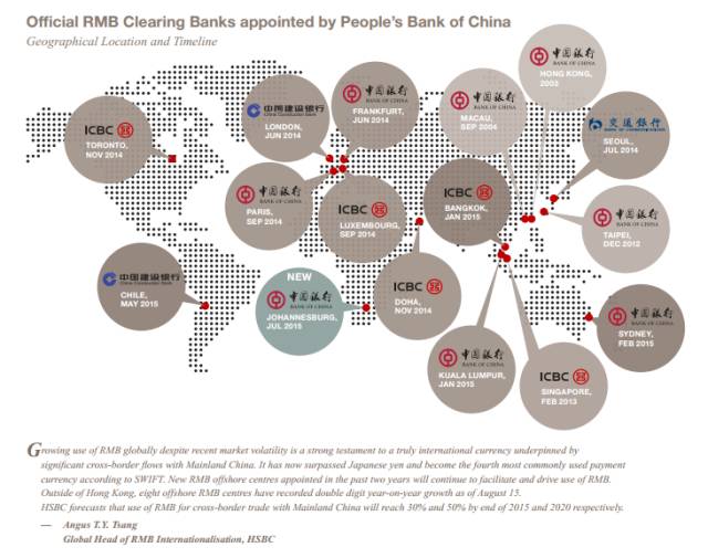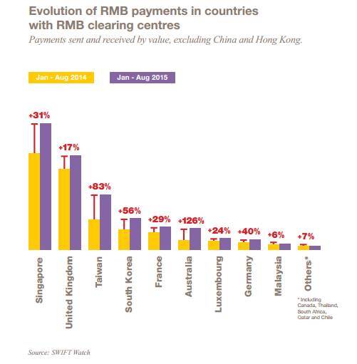 2015年,共有5家新的人民币清算中心分别在吉隆坡、曼谷、悉尼、智利和南非成立。SWIFT表示,在过去的8个月,大多数已经成立了人民币清算中心的国家依然保持人民币支付的同比增长,涨幅最快的有台北(83%)、首尔(56%)和悉尼(126%)。