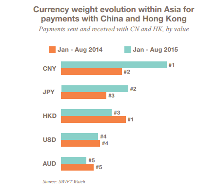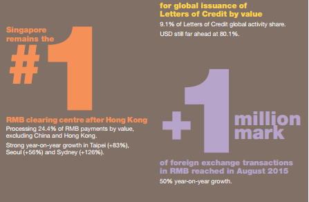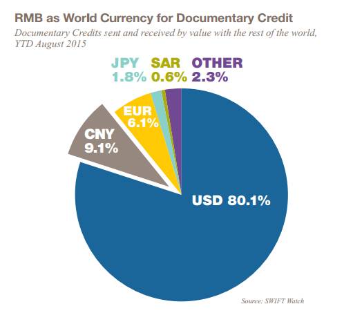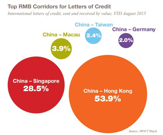 在2015年8月使用人民币最多的三个国家分别是中国、香港和新加坡,因此人民币业务明显集中在亚太地区。中港的银行间人民币信用证支付比例超过50%,中国和新加坡之间的比例约30%。