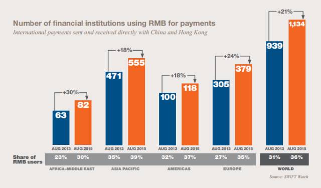 2015年8月,超过1,700家金融机构在全球使用人民币进行支付,相比去年上涨14%。这个数据表明,在中港以外的地区,有近600家金融机构在交易中使用人民币进行支付。