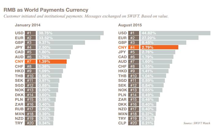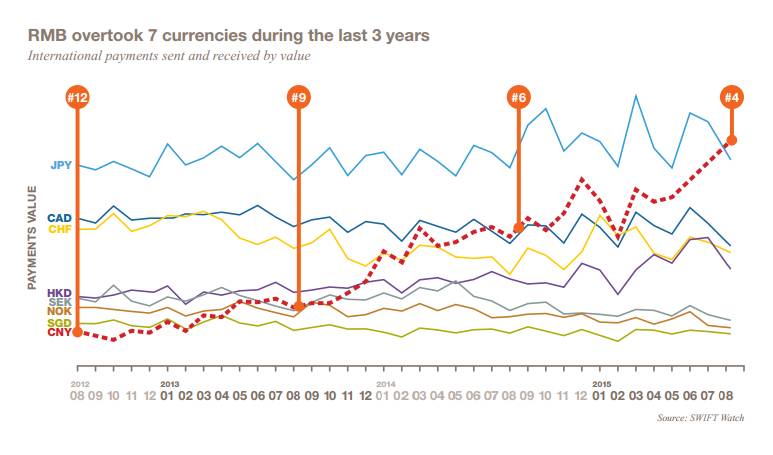 SWIFT数据显示,人民币已经于2015年8月取代日元,成为全球第4大支付货币,全球市场份额为2.79%。三年前,即2012年8月份,人民币还排在全球支付货币的第12位,全球市场份额仅为0.84%。