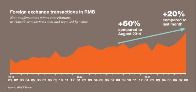 SWIFT数据显示,在2015年8月份,人民币外汇交易已经超过100万笔,相比2014年同期增长50%;相比2015年7月份增长了20%,这一比例的上涨很可能是受8月份中国人民币贬值的影响。