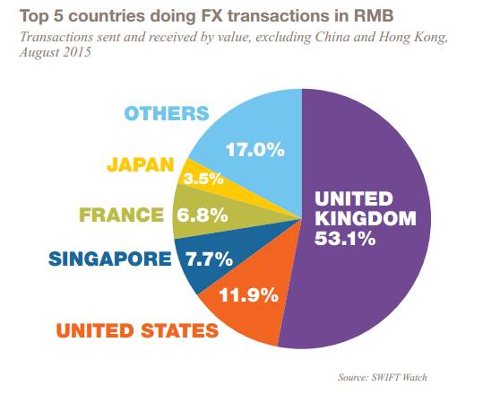 香港是全球最大的人民币离岸中心,约70.4%的人民币支付是在香港进行的。尽管在2015年8月份全球有超过100个国家使用人民币支付,但是其中90%以上都集中在10个国家。新加坡占24.4%,美国占21.6%,台湾则一跃成为第三大人民币离岸中心。