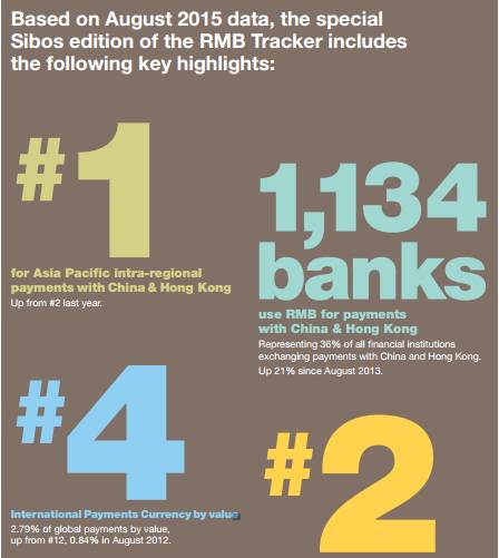环球银行金融电信协会(SWIFT)于2011年9月推出每月人民币追踪报告,以帮助了解人民币在迈向国际货币方向的进展。2015年10月12日-15日,SWIFT将举行年度国际银行运营研讨会(SIBOS),因此特别推出了一期人民币追踪报告,以提供人民币作为国际货币的最新进展和综合概述。