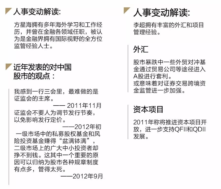 刚刚履新的两位证监会副主席分工已经确定。李超分管机构部、私募部以及证券业协会、期货业协会、基金业协会;方星海将接替刘新华分管国际部和会计部。作为中国证券市场的最高监管机构,中国证监会正在迎来新一轮变革。