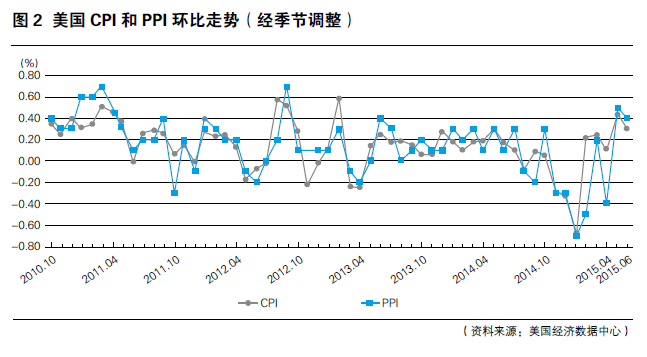 但是,美国经济复苏缓慢且不稳定。2015年2月,美国官方失业率降至5.5%,显示了就业市场增长的强势,但是制造业就业仅环比增长0.06%,增速缓慢;采掘业就业下跌0.9%;只有运输业就业反弹,主要归功于国际油价的下跌。美国商务部公布的3月新屋销售环比降11.4%,创2013年7月以来最大降幅,终结了此前三个月的连涨势头。GDP的季度增长率波动较大,如图1所示。2010年10月至2015年4月,CPI和PPI均在低位徘徊,绝大部分时间在-0.4%-0.4%之间波动,如图2所示。说明美国的经济数据虽有所改善,但与金融市场数据的表现相差甚远,美国强金融、弱经济特征明显。