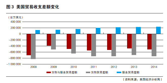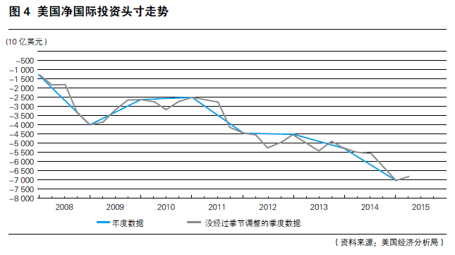 美国还长期面临贸易收支逆差。美国经济分析局的数据显示,美国2014年继续保持逆差,货物贸易逆差7358亿美元,高于2013年的7071亿美元,如图3所示。为了弥补贸易收支逆差,美国对外负债不断增加,是净债务国,而且对外净负债的数量呈逐年不断增加的态势,从2010年末净投资头寸约-2.5万亿美元增加至2014年末约-7万亿美元,如图4所示。