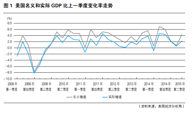金融产品价格的上涨修复了企业、家庭的资产负债表,产生了财富效应。企业、家庭财富的增加,扩大了需求和供给,刺激了美国经济的复苏和增长。根据美国经济分析局的统计数据,2009年第二季度至2014年第四季度实际GDP年均增长2.2%;失业率自2010年以来不断下降,2015年4月为5.4%,5月为5.5%,6月和7月均为5.3%,基本上回到了危机爆发前的5%左右的水平;制造业采购经理人指数PMI于2009年8月回到了50点以上,一直保持至今;新屋开工情况自2011年9月显著好转,目前也已经回到了2008年危机爆发前的水平。