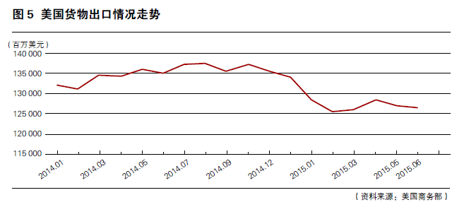 增加企业、政府的融资成本。美元升值会降低美国出口企业的竞争力。根据国际清算银行的数据,美元名义有效汇率从2014年7月的100.49上升至今年6月的113.69,升值13.1%,实际有效汇率也从2014年7月的98.62升至今年6月的109.95,升值了11.5%。2014年7月美元快速升值以来,美国的货物出口快速下降,从1372亿美元降至今年1月的1285亿美元,又降至6月的1266亿美元,如图5所示。随着8月11日人民币汇率中间价市场化改革,人民币向市场汇率回归而产生的贬值,势必会使美国的商品出口进一步恶化。如果美联储加息,企业的融资成本加大,又会进一步降低企业的盈利空间和竞争力,影响美国经济的复苏势头。美国的货币政策陷入两难选择。