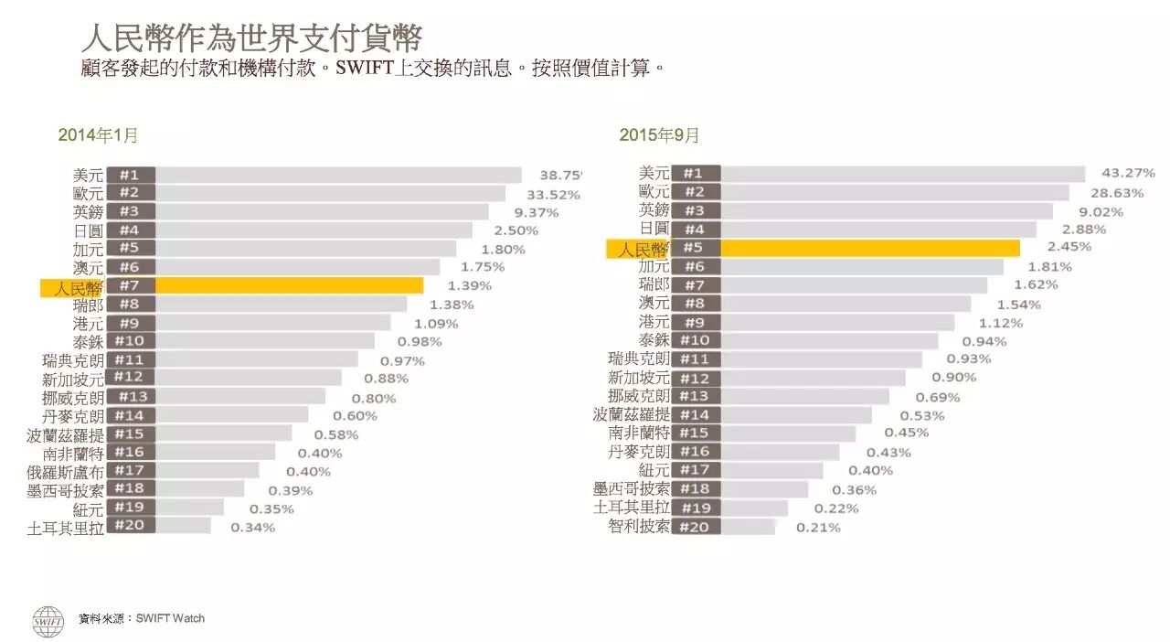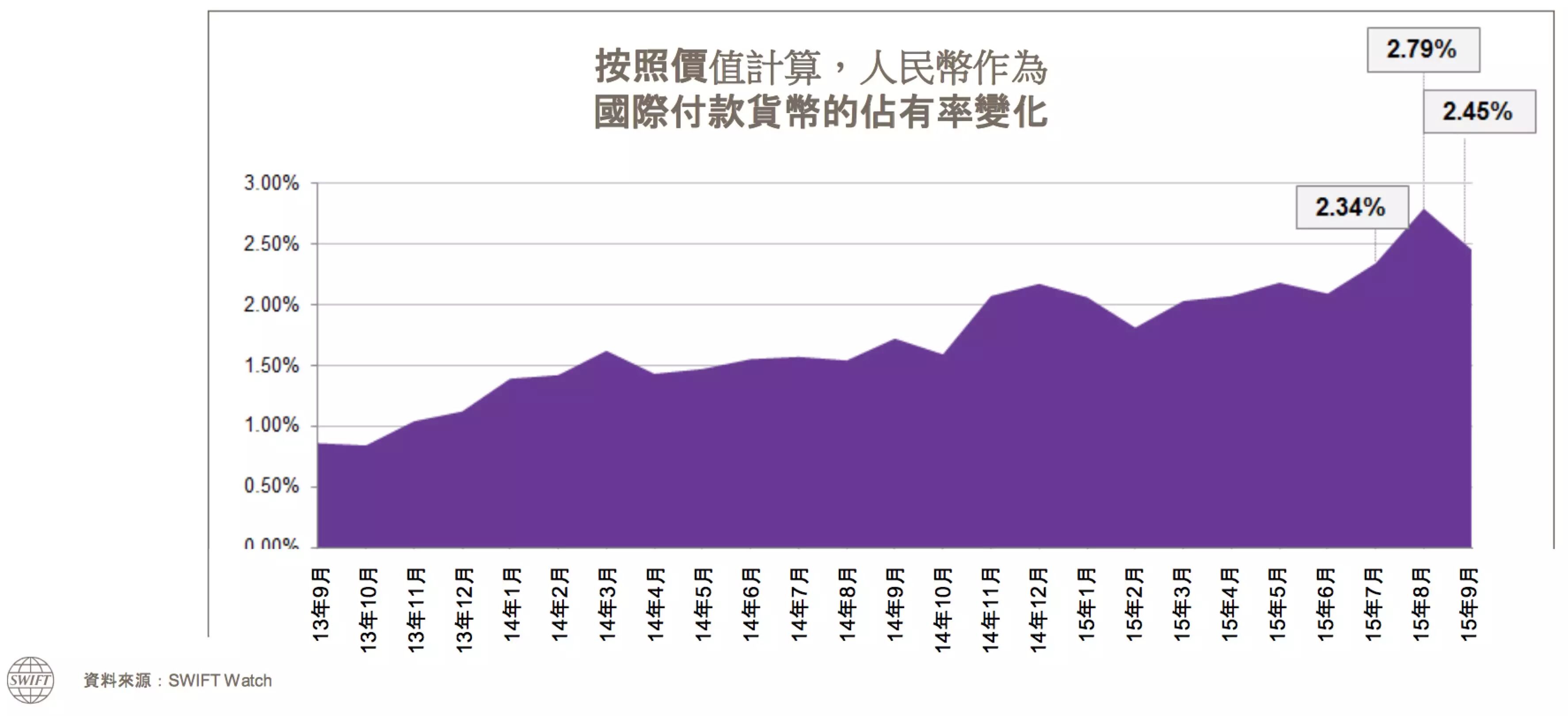 2015年10月29日,SWIFT的最新人民币追踪显示,按照价值计算,人民币在国际付款货币的排名回落一位至第五位。2015年9月份,人民币占全球付款2.45%,较2015年8月的2.79%有所减少。然而,SWIFT数据亦显示人民币的相关增长仍然向好。2015年9月份,人民币活动占有率高于2015年7月份以至过往月份。