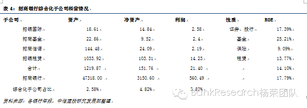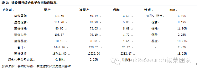 3、经营效率的差异也体现在综合化子公司的运营效率上。以2014年信息披露较为完整的建设银行(大行)及招商银行(股份行)为例。建设银行综合化子公司净利润仅占比0.91%,平均ROE7.43%,招商银行综合化子公司净利润占比3.82%,平均ROE14.1%。分项来看,建行各项业务ROE均低于招行。