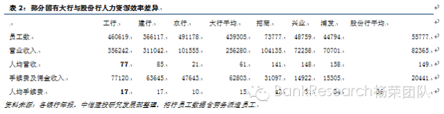 2、从人力资源效率上来看,国有大行人均创收能力明显弱于股份行。我们选取了中报中6家公司做对比,无论从营业收入上看还是从人均手续费收入上看,股份行人均收入是大行的两倍以上。